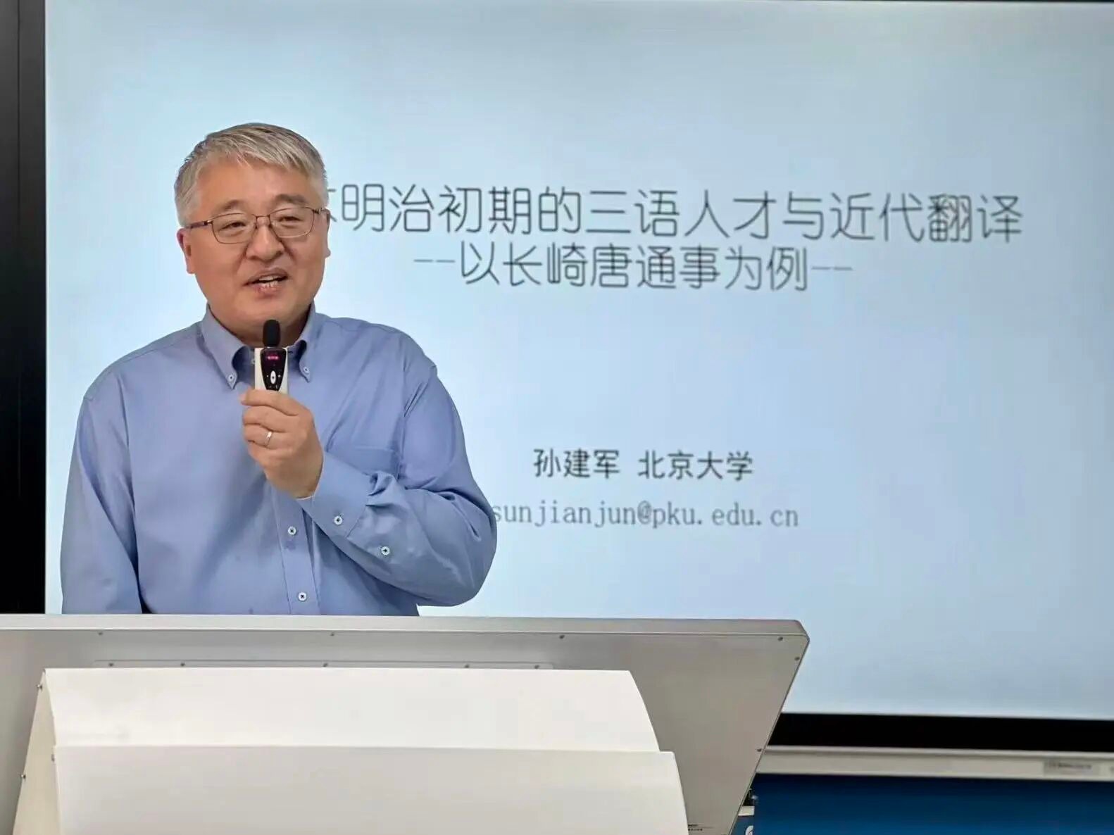 北京大学孙建军教授以“日本明治初期的三语人才与近代翻译——以长崎唐通事为例”为题,为我院师生带来深度专题讲座。本次讲座致力于引导师生透过历史的纵深,审视语言在文明演进与转型中所承载的关键动能,从而超越对语言本体的表层掌握,进一步思考跨文化沟通与知识转译在全球知识流动与文明对话中的深层价值与当代意义。
