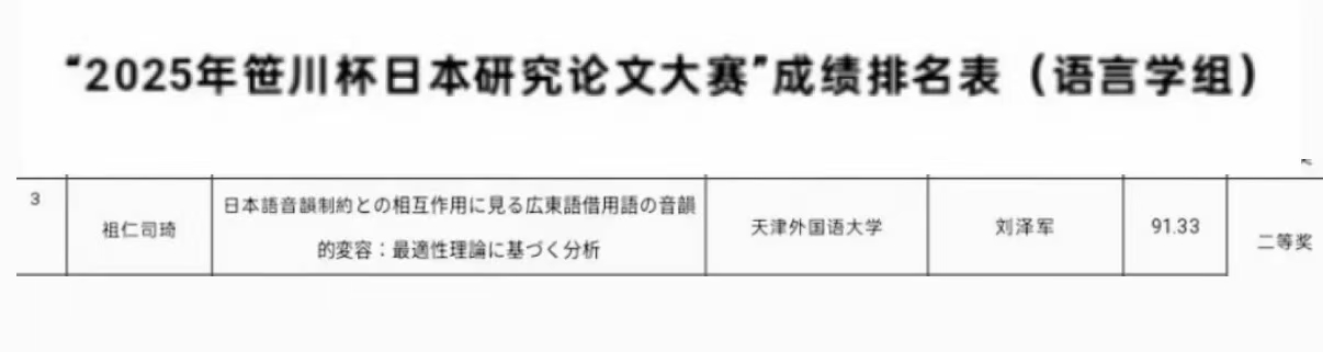 近日,在吉林大学举办的2025年笹川杯日本研究论文大赛中,天津外国语大学日语学院再传捷报。由刘泽军教授精心指导的祖仁司琦同学凭借出色研究成果,荣获大赛语言组二等奖。