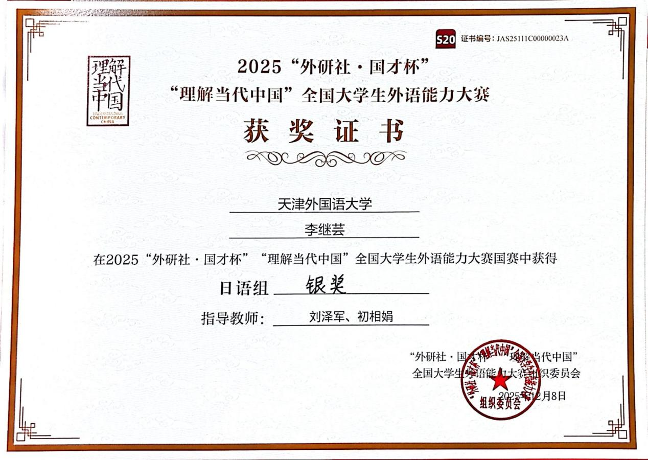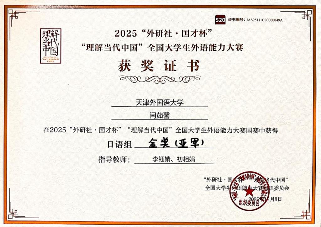 12月6日,2025“外研社·国才杯”“理解当代中国”全国大学生外语能力大赛(多语种组)全国总决赛在北京顺利举行。天外日语学子再创佳绩,1人获得日语组金奖,1人获得银奖,2人获得铜奖。