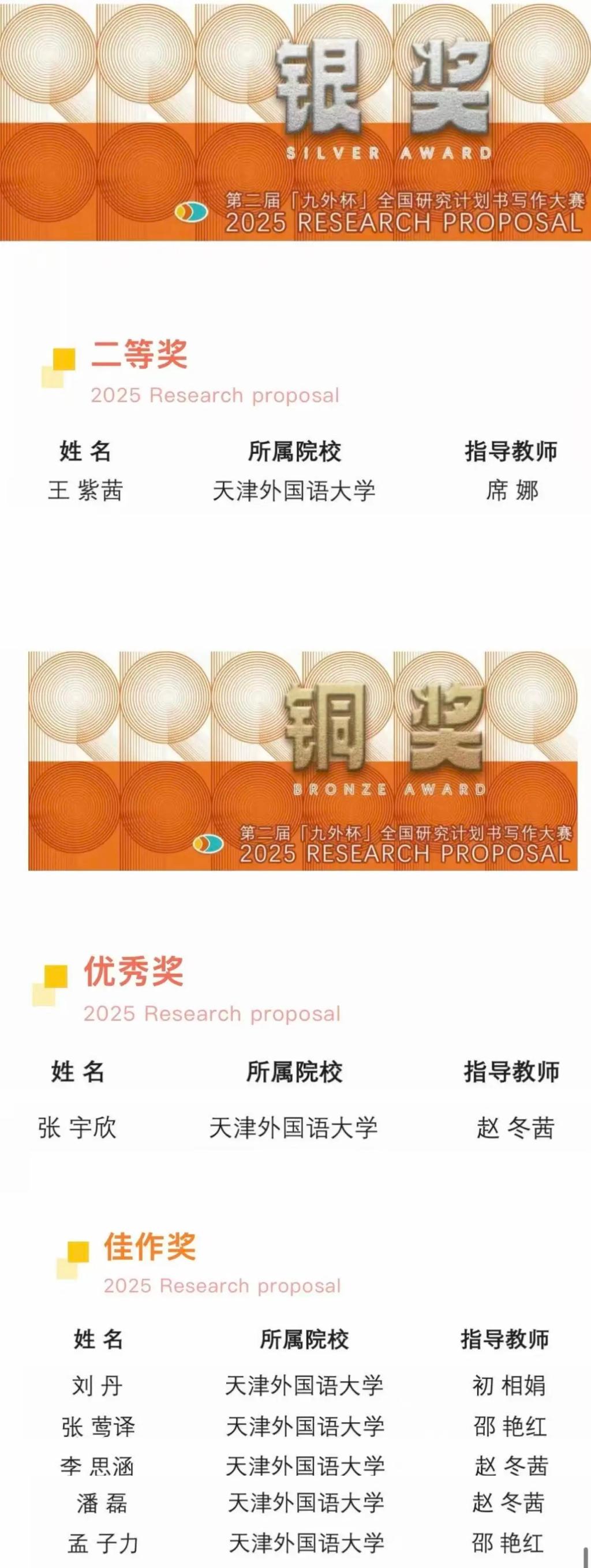 此次获奖展现了我院学子出色的学术研究潜力,更凸显了研究计划书写作在人才培养中的关键价值。严谨规范的研究计划书不仅锻炼学生发现问题、整合文献、设计论证的系统能力,也为未来开展高水平学术研究与跨领域实践奠定了坚实基础。期待更多青年学子以此为起点,以扎实的研究规划能力推动学术创新与实践突破,为我国对外语言文化传播与国际交流事业注入新的智慧活力。